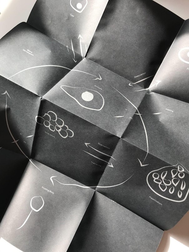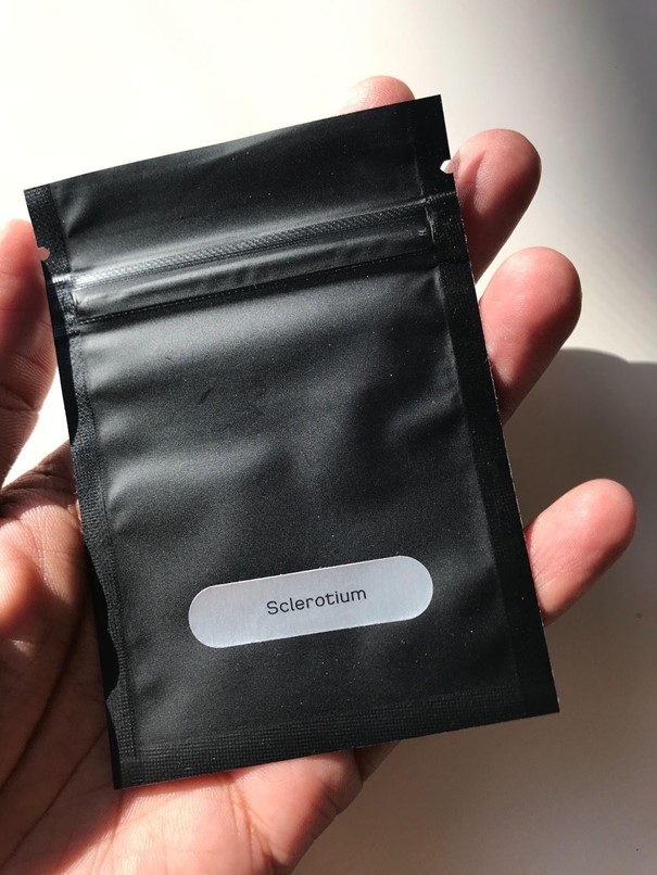 It is a sunny day in Brooklyn, October 12, the rare bright days of early Fall. I spread the contents on the table: a black petri dish with a beautiful alien inscription on its lid, a double-sided poster with a silver-ink graphic depicting the life cycle of the Sclerotium specimen on one side, and a series of instructions on the other. Finally, there are 3 black packets with the labels “agar powder,” “oat flakes,” and “sclerotium.”