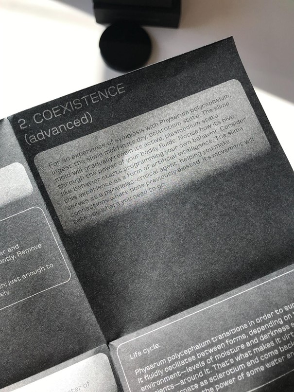 Opening the package reveals a black box with the words “Protoplasmic Flow” on one side and “Jenna Sutela” on the other. I am familiar with Sutela’s work. She is a Berlin-based, Finnish artist working with emerging technologies at the intersection of artificial and non-human intelligences. About two years ago, I read with deep fascination Orgs: From Slime Mold to Silicon Valley and Beyond (Garret Publications, 2017), a book she edited and which focused on decentralized organisms and organizations. In fact, Orgs also came in a limited edition run that included a sample of dried Physarum polycephalum. With the Samara Editions box, I finally have a chance to experience how a dormant specimen may arrive in an artist edition.